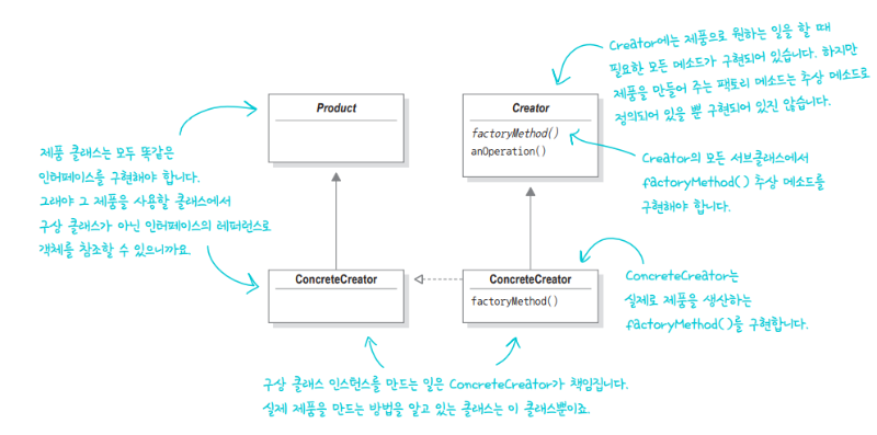 객체를 생성할 때 필요한 인터페이스를 만듭니다. 어떤 클래스의 인스턴스를 만들지는 서브클래스에서 결정합니다. 팩토리 메소드 패턴을 사용하면 클래스 인스턴스 만드는 일을 서브클래스에게 맡기게 됩니다.