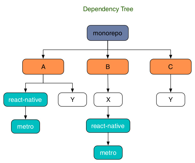 nohoist를 사용하여 모노레포 프로젝트 “monorepo”에서 반응 네이티브가 호이스팅되는 것을 방지하는 방법을 설명하기 위해 단순화된 의사 예제를 살펴보겠습니다. "monorepo"에는 A, B, C의 3개 패키지가 있습니다.
