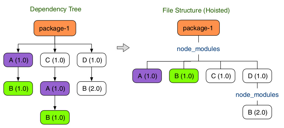 설치하는 과정에서 하위 폴더의 package.json의 종속성의 중복을 제거한 후 루트 경로의 node_modules로 호이스팅하여 설치한다.