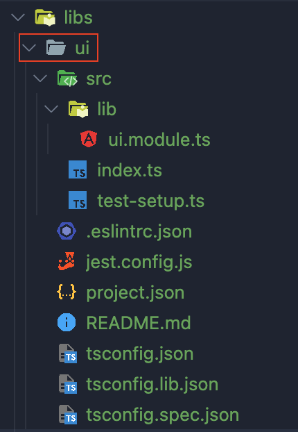 위 명령으로 ui라는 이름의 Angular 컴포넌트가 라이브러리에 추가되어 다음과 같은 구조가 만들어진다.