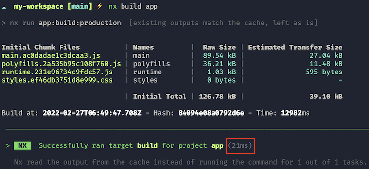 이번에는 빌드가 바로 완료됨(21ms)을 볼 수 있고, 맨 아래 텍스트에서 볼 수 있는 것처럼 Nx는 로컬 캐시에 해당 Artifact가 존재하는 경우 가져다 쓰는 걸 알 수 있다. 단, 캐싱은 Nx CLI에서만 동작하기 때문에, Angular CLI를 사용하는 경우엔 Computation Caching이 적용되지 않는다.