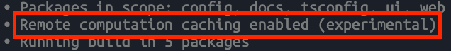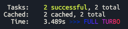 이렇게 모든 작업에 대한 캐싱을 진행하기 때문에 변화된 부분만 재빌드하고 나머지는 캐싱한 것을 사용하면서 Turborepo는 작업 속도를 높일 수 있다.