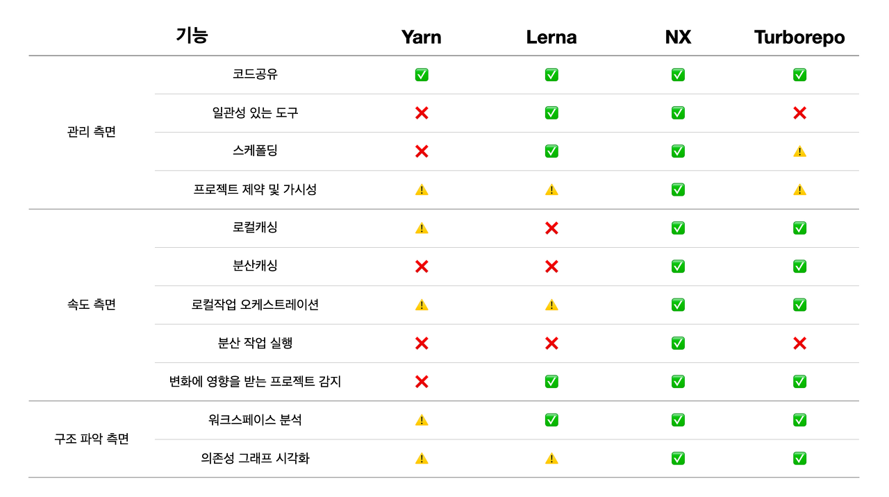 위에 소개한 Yarn, Lerna, Nx 그리고 Turborepo를 간단히 비교하면 다음 표와 같다.