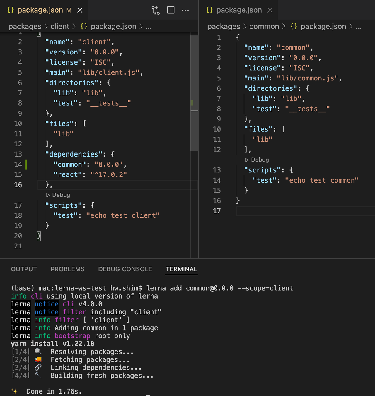 아래와 같이 client workspace에 react 패키지를 설치할 수 있다. --scope 없이 사용하면 모든 workspace에 추가한다. 추가하려는 의존성이 workspace라면 해당 workspace를 제외한 모든 workspace에 추가된다.