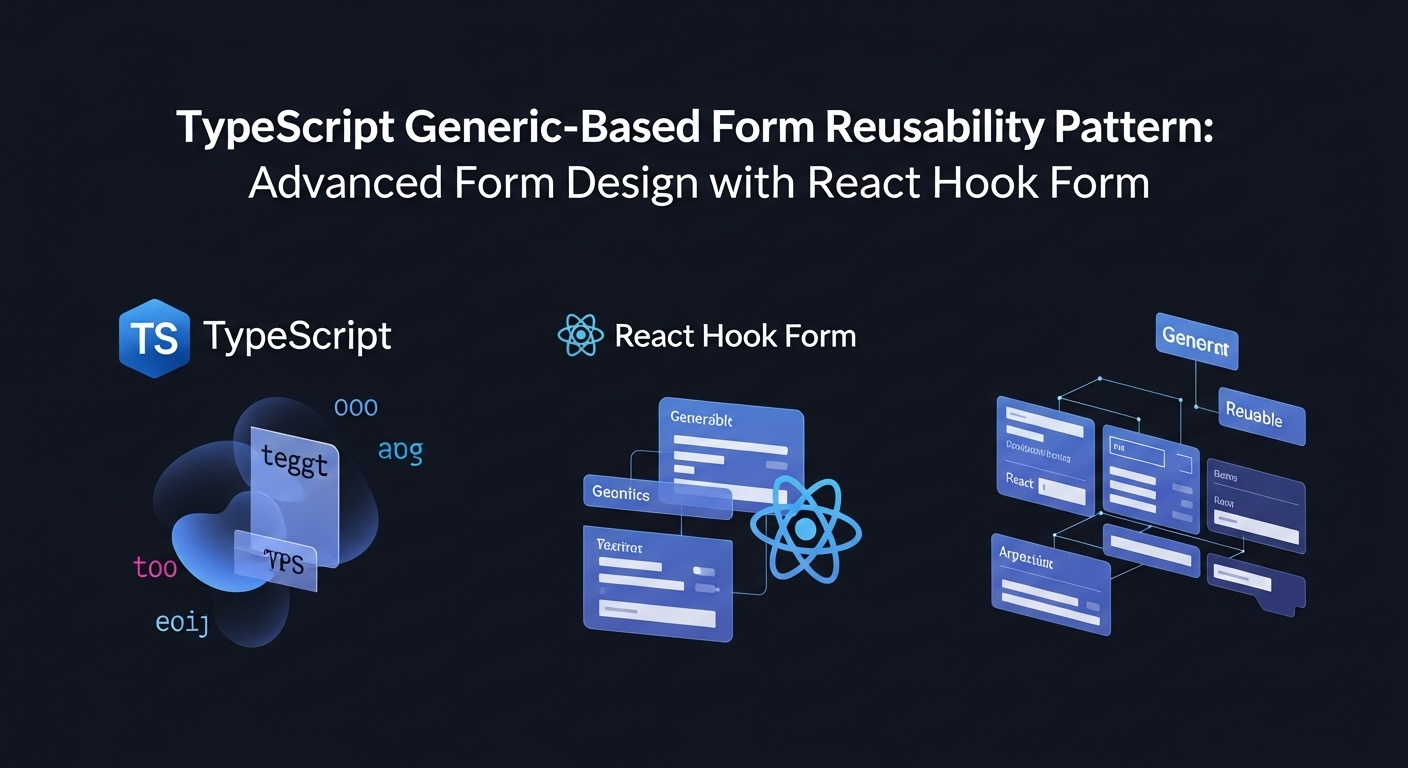 A modern, clean, and professional cover image for a programming lecture titled "TypeScript Generic-Based Form Reusability Pattern: Advanced Form Design with React Hook Form". Include visual elements representing TypeScript (e.g., the TS logo or type annotations), React Hook Form (e.g., form components, hooks), and reusable form patterns (e.g., modular, interconnected form blocks or components). Use a tech-oriented color scheme, such as blues, purples, or dark themes with bright accents, to convey a high-level, advanced programming concept. Include abstract representations of generic types and dynamic forms. The style should be sleek, contemporary, and suitable for a developer audience.